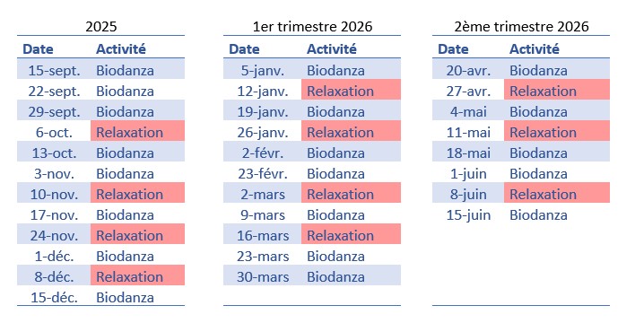 Nous sommes heureuses de vous annoncer que pour cette nouvelle saison, nous enrichissons notre programme du lundi soir avec des cours de biodanza ainsi que des séances de relaxation proposées ponctuellement. Un calendrier est disponible ci-dessous pour le prochain trimestre pour une meilleure organisation.